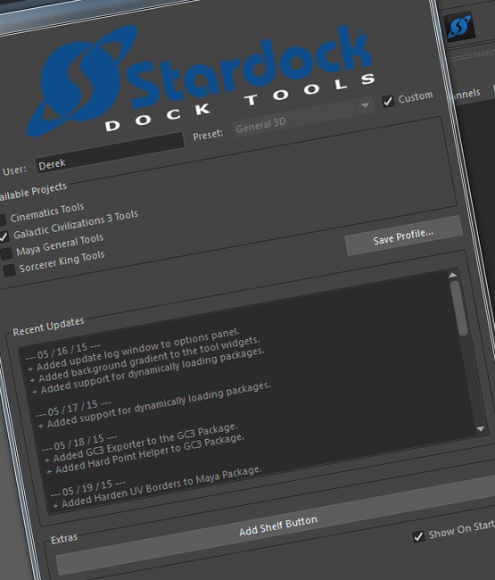 Dock Tools is a tools hub for artists inside of Maya. It works by loading modular packages and tools, organized by project,